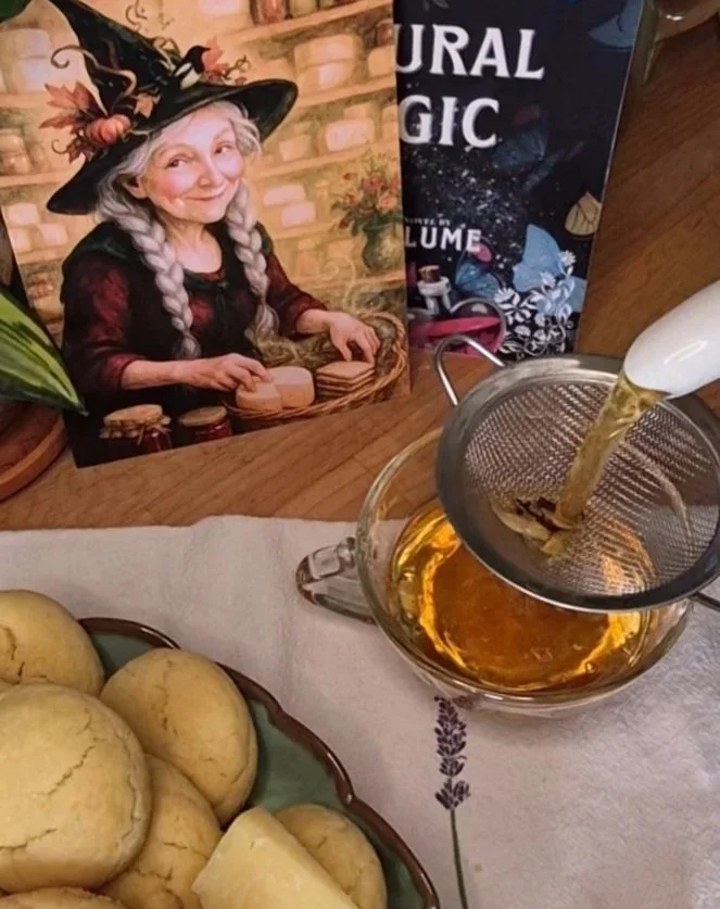 This floral tea blend is what I imagine Minerva might make for a morning of respite before the day starts. Her herbal tea ritual would likely include careful crafting of her tea. Then sitting at a lovely table nestled in her bookshop’s bay window, she would sip from her cup while the world wakes outside her window. Lemon cookies and cheese hunks are close at hand, especially if Minerva’s friend Zephyr is visiting.